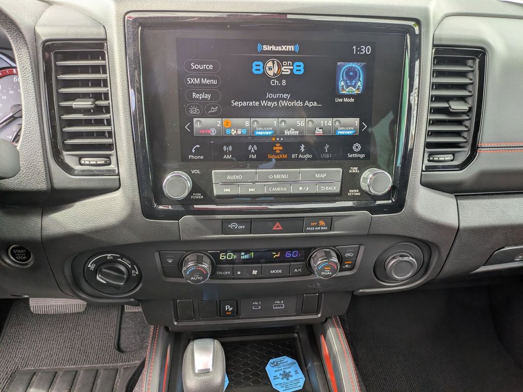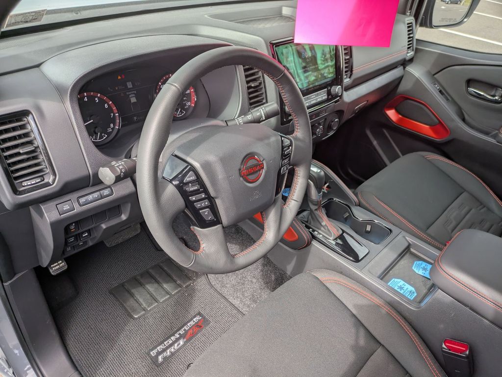Step inside the Frontier PRO-4X and you'll be greeted by a spacious and well-appointed cabin, featuring premium cloth seats with PRO embroidery, a leather-wrapped steering wheel, and a convenient center console. The dual-zone automatic climate control and Fender Premium Audio System with 10 speakers create a comfortable and immersive driving experience.